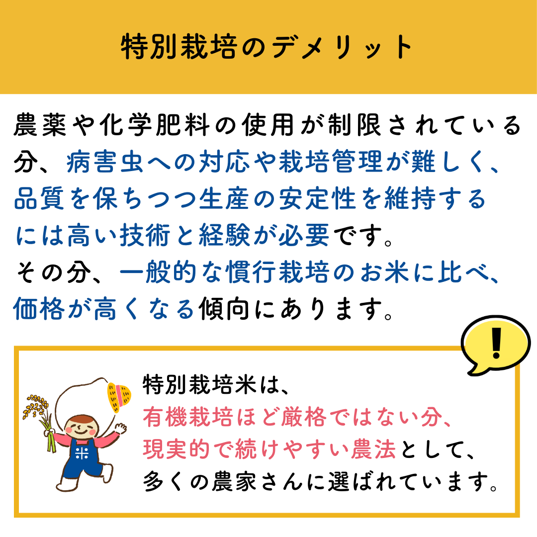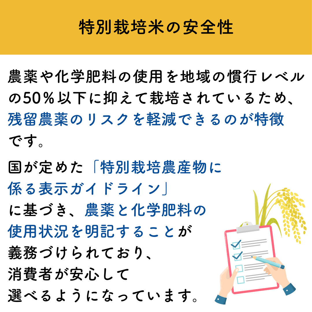 ここでは、お米選びのポイントとして特別栽培米の特徴を解説します。