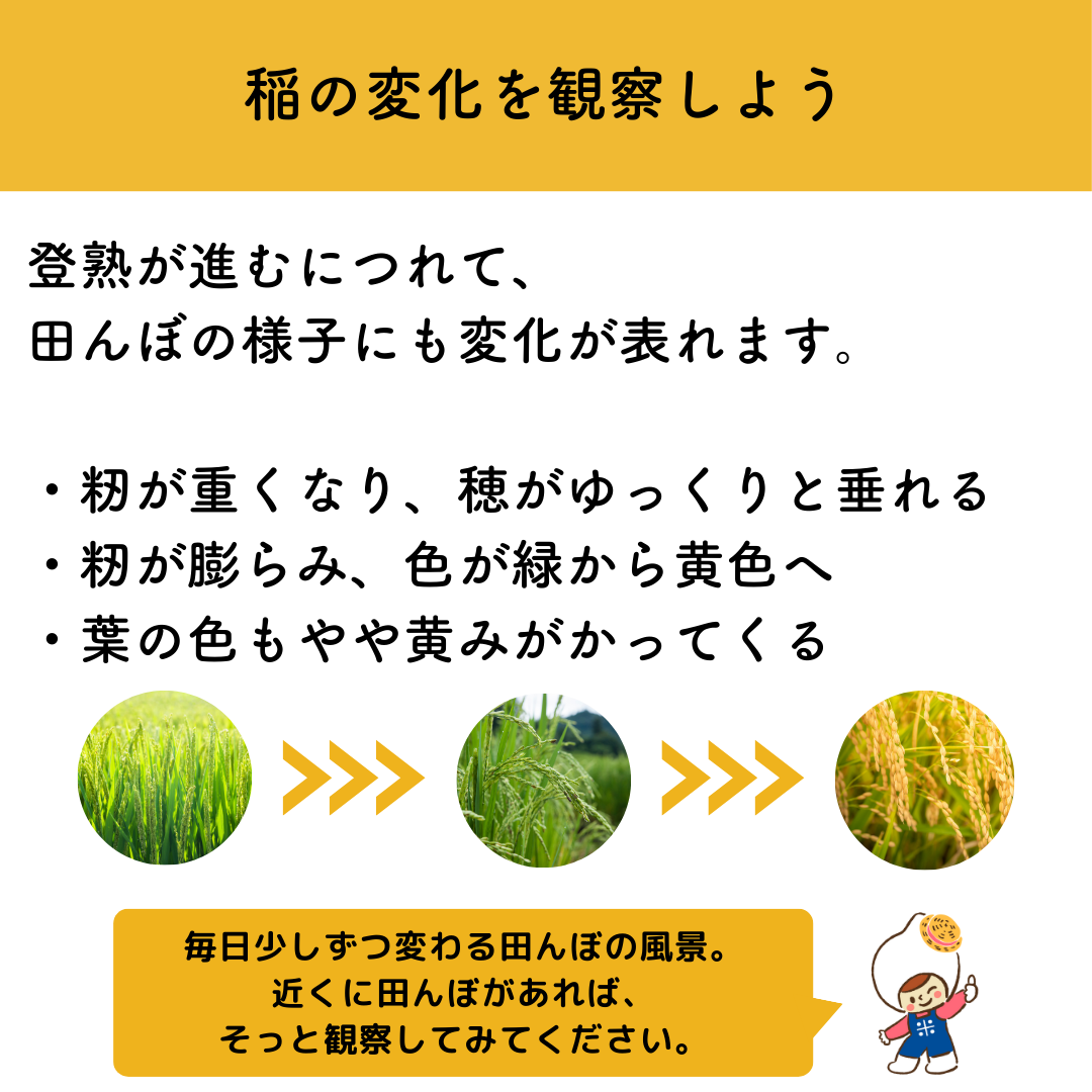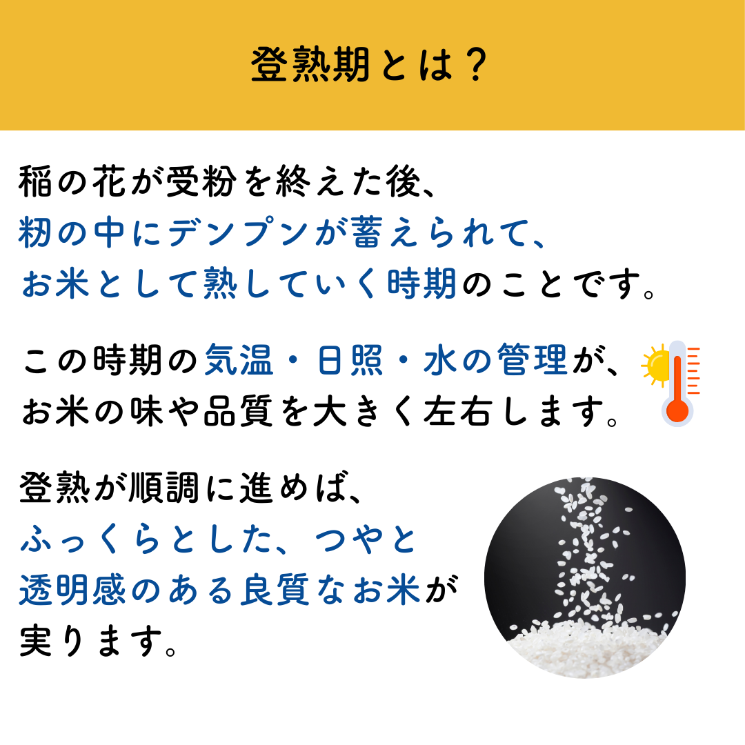 今は、お米が育つための大切な期間「登熟期(とうじゅくき)」を迎えています。