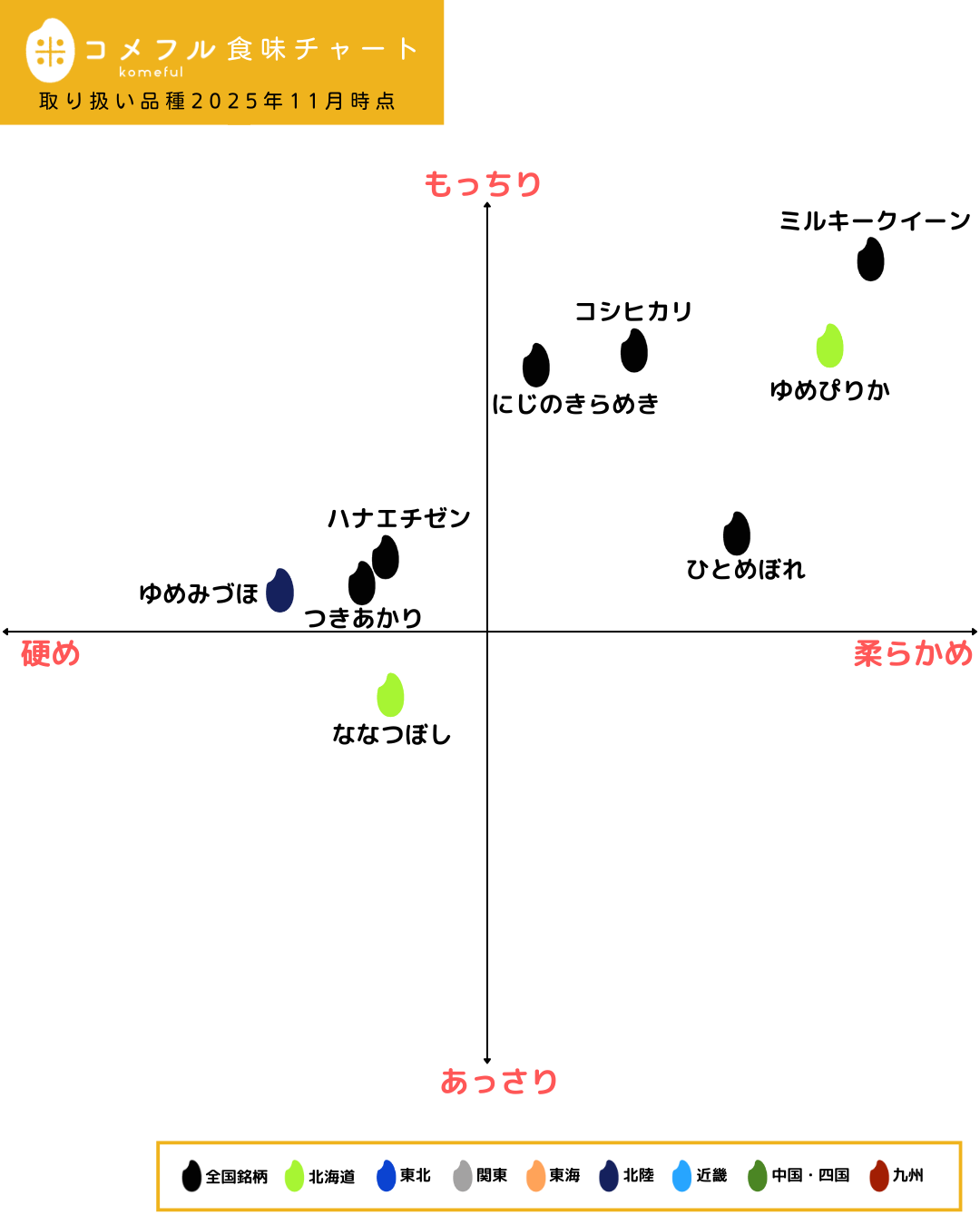 適度な粘りと飽きのこない甘さが特徴です。炊き上がりがふっくらとしていて、ツヤ・旨味・香りを含めたトータルバランスに優れた美味しさです。